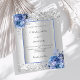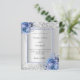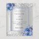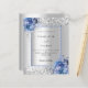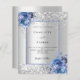 Fondo con apariencia de plata falso decorado con rosas azules, flores y confeti. Personalice y agregue sus nombres y detalles de la boda. Letras negras.