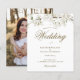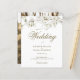 Hermosa invitación de boda floral blanca con flores de primavera delicadas que enmarcan los detalles de su boda en elegante letra dorada. El reverso presenta su foto especial. Diseñado por Thisisnotme©