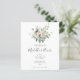 Una elegante invitación de boda económica con un hermoso ramo de flores silvestres campestres se sitúa sobre los detalles de su boda en texto elegante. El reverso tiene un color de fondo coincidente que se puede personalizar según su color favorito. Diseñado por Thisisnotme©