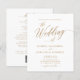 Invitación de boda dorada y blanca con caligrafía elegante todo en uno con detalles en la parte posterior... Nuestra invitación de boda "todo en uno" única y asequible presenta una elegante caligrafía dorada a mano combinada con texto serif para una invitación de boda clásica y elegante. La parte posterior de la invitación contiene todos los detalles que normalmente se ven en tarjetas separadas en el paquete de boda, incluyendo hora y lugar de la recepción, opciones de alojamiento, sitio web de la boda, información de RSVP y registro de regalos. Esta invitación de boda de estilo moderno fue diseñada para ser elegante y consciente del presupuesto... sin mencionar que ahorra tiempo. En la parte posterior también hay una plantilla de código QR gráfico que puede reemplazar con su propio código (o eliminar si no planea usar uno). Todo el texto de ejemplo (aparte de los elementos de caligrafía gráfica) se puede revisar fácilmente con su propia información en la plantilla de personalización.