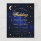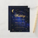 Una invitación de boda económica con tema de boda celestial, con las estrellas doradas y la luna creciente sobre un fondo azul de noche estrellada. La palabra Boda y los nombres están escritos en una elegante letra caligráfica. La luna y la palabra Boda son de falso pan de oro, el resto del texto es dorado. En el negro, solo está la luna y la estrella sobre un fondo azul de noche estrellada.