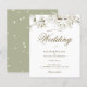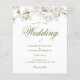 Hermosa invitación de boda floral blanca con flores delicadas de primavera que enmarcan los detalles de su boda en elegante letra dorada. Personalice con los detalles de su evento especial. El reverso presenta pétalos de flores blancas dispersos. Diseñado por Thisisnotme©