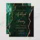 Esta elegante invitación de boda presenta una imagen de fondo de ágata de acuarela esmeralda recortada con brillo dorado falso. El texto personalizable combina escritura moderna dorada, caligrafía copperplate y fuentes itálicas. El reverso presenta un diseño coordinado de ágata esmeralda y dorada.