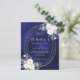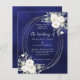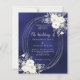 Un fondo azul y desigual. Un marco de color falso plateado ovalado decorado con flores blancas de color agua, rosas. Personalice y agregue sus nombres, detalles. Texto blanco. Atrás: agregue la URL de su sitio web al código QR para RSVP y/o más detalles. 1 hoja = 1 borde impreso de invitación al borde.