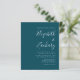Ahorre el coste de imprimir y enviar por correo tarjetas RSVP independientes con esta sencilla y moderna invitación a boda todo en uno, con texto blanco sobre un fondo azul verde azulado. Añada los nombres de la novia y del novio en una caligrafía elegante de escritura a mano y los detalles en letra sans serif. El reverso proporciona espacio para los detalles del boda, junto con un código QR que los huéspedes pueden escanear para visitar su sitio web y RSVP, con un fondo azul verde azulado.
