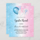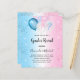 En cuanto al género, podrás ver una ducha de bebé, un fondo de degradado azul y rosa. Decorada con globos purpurina y azul, rosa y blanco. Personalice y agregue el nombre de los padres y los detalles del fiesta. El nombre y el texto: Revelación de género están escritos con un guión de estilo con letras a mano