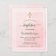 Un bautismo moderno y elegante, celebrando a una niña. Un fondo rosa oscuro y marcos blancos decorados con pequeños destellos dorados, puntos y una cruz dorada. Personalice y agregue un nombre y detalles del fiesta. Letras de color negro.