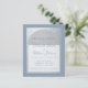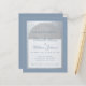 Una invitación moderna para una fiesta de compromiso. Sobre un fondo rectangular azul polvoriento, tiene un arco de lámina plateada falsa que contiene texto azul polvoriento sobre fondo blanco. Los nombres están escritos en una elegante letra caligráfica; la primera línea es texto arqueado.