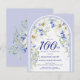 La elegante plantilla de invitación a la Fiesta del Cumpleaños 100 incluye un arco floral de Boho hecho de margaritas blancas y flores silvestres azules. Este artículo forma parte de la colección de flores azules y blancas Boho Arch.