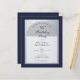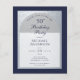 Una invitación de cumpleaños moderna. Sobre un fondo rectangular azul marino, tiene un arco de falso foil plateado que tiene dentro texto azul marino sobre fondo blanco. Las palabras Fiesta de cumpleaños están escritas en una elegante letra caligráfica; la primera línea es texto arqueado.