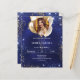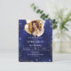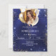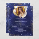 Una invitación moderna, elegante y glamurosa para una fiesta de cumpleaños de 21 (o cualquier edad). Un fondo azul marino, decorado con brillantes azules y purpurinas de oro fino y globos dorados. El color azul es desigual. Personaliza y agrega tu nombre, foto y detalles del fiesta. Un marco fotográfico al estilo de un balón. 1 hoja = 1 borde impreso de invitación al borde.