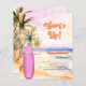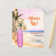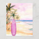 Una invitación de estilo retro para una fiesta de cumpleaños en la playa para un chica. Una playa de arena de color agua, olas del océano y palmeras como telón de fondo, y una tabla de surf rosa en la playa. Texto: ¡Surf's Up! 1 hoja = 1 borde impreso de invitación al borde.