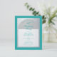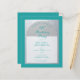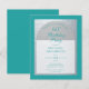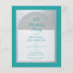 Una invitación de cumpleaños moderna. Sobre un fondo rectangular azul turquesa, tiene un arco de lámina de plata falsa que contiene texto turquesa sobre fondo blanco. Las palabras Fiesta de Cumpleaños están escritas en una elegante letra caligráfica; la primera línea es texto arqueado.
