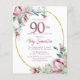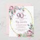 Elegante plantilla de invitación a la fiesta de cumpleaños número 90 con un marco dorado y dos arreglos de rosas rosa rubor. Todo el texto es editable.