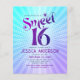 "Feliz Dulce 16 cumpleaños". Envíe esta genial invitación retro boho, personalizada de fiesta de presupuesto para un evento que recordar. Tipografía divertida, de moda, audaz morada y azul marino con la tipografía moderna sans serif superpone un fondo de rayos pop turquesa y morado gradiente con puntos blancos. En la parte posterior, un gráfico blanco dulce de 16 sobrepone un fondo pop azul y púrpura más oscuro. Personalice el texto del personalizado con el nombre de su hija, así como otros detalles del fiesta. ¡Garantizada la diversión para su celebración especial de cumpleaños! En esta moderna y especial colección también se ofrecen platos, servilletas y otros productos de cumpleaños. Simplemente escriba el nombre del chica de cumpleaños, el año de cumpleaños y la información del lugar de fiesta y puede personalizar fácilmente esta invitación de cumpleaños. Por favor, envíame cualquier pregunta o petición.