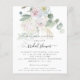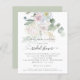 Invitación de Despedida de Soltera Bohemio Floral de Eucalipto. Una alternativa MÁS PEQUEÑA de 4,5” x 5,6” económica. Disponible en PAPEL DE TARJETA de 110 lb SEMI BRILLANTE o en PAPEL DE STOCK MÁS FINO de 80 lb con ACABADO DE SATÉN. Los sobres son un extra opcional. Estilo bohemio moderno con flores y follaje en verde salvia y rosados desde la parte superior con tinte que se gradúa para caer parcialmente detrás del texto. Despedida de Soltera está en una fuente de estilo escritura a mano. Personalice fácilmente el texto con sus propios detalles.