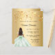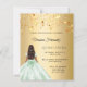 Un falso fondo dorado. Decorada con estrellas doradas y un chica con un vestido verde. Personalice y agregue un nombre y detalles. 1 hoja = 1 borde impreso de invitación al borde.