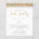 Invite al Purpurina de Presupuestos Dorados Weekend Hen Fiesta. Un precio económico menor 4,5" x 5,6" alternativa. Disponible en un ALMACENAMIENTO DE TARJETAS SEMI-GLOSS de 110 lb que es la opción predeterminada (más grueso para las invitaciones), O UN ALMACENAMIENTO DE PAPELES DELGADOS SATIN FINISH DE 80 lb (ideal para los gabinetes). Los sobres son un extra opcional y son algo más grandes que el tamaño de la tarjeta. El encabezado principal Hen Fiesta está en una tipografía de guión definida y el resto del texto que puede personalizar fácilmente, así como los detalles del itinerario al revés.