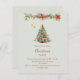 Una invitación de invierno para una fiesta de Navidad. Un fondo suave y claro de color verde salvia en la parte delantera decorado con un árbol de pino dibujado a mano con acuarela con adornos rojos y dorados. Algunas estrellas y una guirnalda decorada con conos y flores de Poinsettia rojas. Personalice y agregue los detalles de su fiesta.