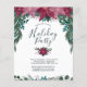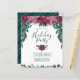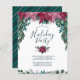 Este diseño rústico de boho presenta un bonito ramo acuático en cascada de poinsettias de oro rojo burdeos y rosa rosa negro de color burdeos, con bayas y un frondoso follaje de invierno en la parte superior, con vegetación eucaliptos y ramos de roca verde, en tonos verde verde azulado con detalles de oro sutil. Debajo de los poinsettias está el texto, "Por favor únanse a nosotros para una fiesta de Navidad" en la popular tipografía de sif y caligrafía para una mirada con letras a mano en verde verde azulado oscuro, seguido de texto de personalizable para los detalles del fiesta y más vegetación y bayas en la parte inferior. La parte posterior de la tarjeta presenta un fondo verde verde azulado rico con rayas diagonales en color burdeos, rosa y blanco para que coincidan con la parte delantera. Puede personalizar este elemento cambiando el texto de la plantilla de producto.