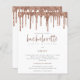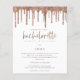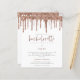 Invitación de fin de semana de Despedida de Soltera con Brillo de Rosa Dourada y Goteo. Una alternativa de precio económico MÁS PEQUEÑA de 4.5” x 5.6”. Disponible en un PAPEL DE TARJETA de 110 lb SEMI BRILLANTE, que es la opción predeterminada (recomendada para invitaciones), O en un PAPEL MÁS FINO de 80 lb con ACABADO DE SATÉN (ideal para inclusiones). Los sobres son un extra opcional y son ligeramente más grandes que el tamaño de la tarjeta. El encabezado principal "Hen Party" está en una tipografía de escritura rosa, y el resto del texto se puede personalizar fácilmente, al igual que los detalles de su itinerario en el reverso.