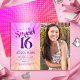 "Feliz Dulce 16 cumpleaños". Envíe esta genial retro boho, invitación personalizada de fiesta fotográfica de presupuesto para un evento que recordar. En el lado izquierdo, la tipografía rosa y rosa oscuro, divertida, de moda y audaz, con la tipografía sans serif moderna, domina un fondo de naranja de luz pop y rayos de gradiente rosado con puntos blancos. Una foto personalizado del chica de cumpleaños está a la derecha. En la parte trasera hay un gráfico blanco dulce de 16 que domina un fondo pop rosa y naranja brillante más oscuro. Añada su foto y personalice el texto del personalizado con el nombre de su hija, así como otros detalles del fiesta. ¡Garantizada la diversión para su celebración especial de cumpleaños! En esta colección única y especial también hay disponibles placas, servilletas, pancartas, pegatinas, tarjetas de agradecimiento y otros artículos de cumpleaños. Simplemente reemplace la foto de la plantilla con una de las suyas, escriba el nombre del chica de cumpleaños y la información del lugar de fiesta y puede personalizar fácilmente esta invitación de dulces de 16 años. Por favor, envíame cualquier pregunta o petición.