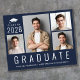 Invitación de graduación minimalista y moderna de color azul oscuro con un collage de fotos de 4 fotos, "Graduado" escrito en letras blancas grandes y su año de clase, nombre y escuela o universidad con tipografía blanca simple.