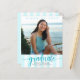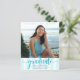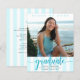 Esté orgulloso, regocíjese y anuncie al mundo que su graduado favorito ha alcanzado su meta con esta impresionante, simple, moderna y personalizada invitación de anuncio de graduación. Un elegante y brillante guión de caligrafía con brillo de turquesa falso, tipografía gris sans serif y una foto de su elección se superponen en un fondo a rayas de turquesa claro y blanco. Personalice el texto personalizado con el nombre de su graduado, nombre de la escuela, año de graduación y fecha de graduación. En el reverso, agregue su nota personal, la próxima escuela a la que asistirán, información de la fiesta, etc. Garantizado para agregar diversión elegante a su ocasión especial.