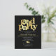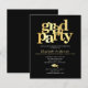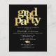 Esté orgulloso, regocíjese y anuncie al mundo que su graduado favorito ha alcanzado su meta con esta impresionante, simple y moderna invitación de fiesta personalizada y económica. Tipografía y un icono de tapa gráfico en negrita con efecto de lámina de oro, junto con tipografía blanca adicional, sobre un fondo negro. Personalice el texto personalizado con el nombre de su graduado, escuela y año de graduación, e información de la fiesta. Garantizado para agregar diversión con estilo en su ocasión especial.