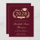 Moderna invitación de graduación de la universidad de color rojo burdeos, económica y con "Clase de", en un ilustracion de una corona de laurel dorado, un topper de grad y un diploma y el nombre del graduado en un elegante guión de oro ligero. Añada su escuela, su escuela principal, honores o planes futuros.