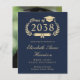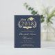 Invitación formal de graduación universitaria de color azul oscuro, con presupuesto reducido, que presenta "Clase de" en un ilustracion dorado claro de una corona laurel que incorpora un topper y diploma de tapa de grado y el nombre del graduado en un elegante guión dorado claro. Añada su escuela, su escuela principal, honores o planes futuros. Su foto llena la parte trasera de la tarjeta. Este papel semibrillante de presupuesto es similar en peso al papel fotográfico. También está disponible una versión más grande del stock de tarjetas 5x7 (envíenos un mensaje para el enlace).