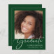 Moderna invitación de graduación verde amigable con presupuesto, con "Graduada" en un elegante guión blanco y su foto y su nombre, colegio y curso de clase en una simple tipografía blanca.