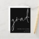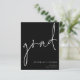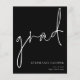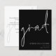 Un precio económico menor 4,5" x 5,6" alternativa. Disponible en un ALMACENAMIENTO DE TARJETAS SEMI-GLOSS de 110 lb que es la opción predeterminada (más grueso para las invitaciones), O UN ALMACENAMIENTO DE PAPELES DELGADOS SATIN FINISH DE 80 lb (ideal para los gabinetes). Los sobres son un extra opcional y son algo más grandes que el tamaño de la tarjeta. Esta simple tipografía blanca sobre el diseño negro clásico para anunciar la noticia de tu graduado tiene un guión estilo de escritura a mano conjunto informal para el encabezado principal, grad, y fácil de personalizar tipografía en el lado inferior derecho con tus detalles y también tu mensaje en la parte posterior.