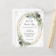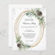 Un fondo blanco. Marco dorado falso ovalado decorado con conos, berros blancos y vegetación de pino. Purpurina de plata falsa, chispas. Personalice y agregue los detalles. Texto negro. Código QR en su sitio web para obtener información sobre RSVP y fiesta. 1 hoja = 1 borde impreso de invitación al borde.