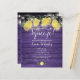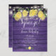 Con una vegetación de limones y luces de cuerdas de bonito sobre un fondo violeta de madera rústica, esta divertida invitación de presupuesto para duchas de novias puede ser personalizada con su información especial para eventos. Diseñado por Thisisnotme©