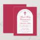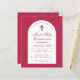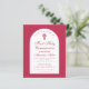Una invitación para la primera comunión de una niña. En un color moderno entre magenta y rojo, tiene un arco blanco con texto rojo magenta en el interior. La ocasión y el nombre están escritos en una elegante letra caligráfica; la primera línea es un texto arqueado.