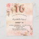 Un fondo de color oro rosa, color rosa oscuro, fino y de aspecto metálico. Decorada con rosa de oro y flores rosadas, rosas, pampas hierba. Personalice y agregue un nombre y detalles del fiesta. El número 16 se escribe con un tipo de letra de estilo globo.
