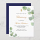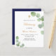 Un fondo blanco adornado con vegetación eucaliptos y una cruz dorada. Personaliza y el nombre de los niños y los detalles de la ceremonia. Letras de color negro y dorado. Fondo azul marino.