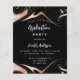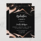 Una invitación moderna para una fiesta de graduación. Un fondo negro decorado con remolinos de oro rosas. Personalice y agregue un nombre y detalles del fiesta. El texto Graduación y el nombre están escritos con escritura de estilo con letras a mano moderna. Texto de color blanco. 1 hoja = 1 borde impreso de invitación al borde.