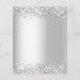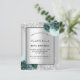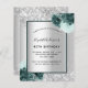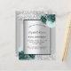 Fondo de color plateado falso decorado con flores verdes y purpurinas falsos de plata, chispas. Personalice y agregue su nombre y detalles del fiesta. Cartas negras.