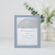 Una invitación moderna para la primera comunión. Sobre un fondo rectangular azul marino, tiene un arco de lámina plateada falsa que contiene texto azul marino sobre fondo blanco. La ocasión y el nombre están escritos en una elegante letra caligráfica; la primera línea es texto arqueado.