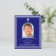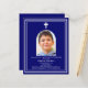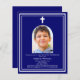 Un fondo azul marino, decorado con un marco blanco y una cruz blanca. Personaliza y añade una foto, nombre y detalles. Texto blanco. Marco de foto en forma de arco.