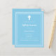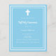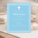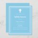 Un fondo azul cielo, decorado con un marco blanco y una cruz blanca. Personaliza y añade el nombre y los detalles. Texto blanco.