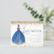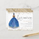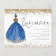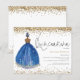 Invitación del Chica de la Marina purpurina Quinceanera. Un precio económico menor 4,5" x 5,6" alternativa. Disponible en un ALMACENAMIENTO DE TARJETAS SEMI GLOSS 110 lb que es la opción predeterminada (recomendado para invitaciones), O UN ACCESO DE PAPEL DE LADRILLO DE 80 lb SATIN (ideal para los gabinetes). Los sobres son un extra opcional y son algo más grandes que el tamaño de la tarjeta. Elegancia espumosa para tu Quinceanera con un ilustracion de la vista de atrás de un chica de cabello oscuro en un hermoso vestido de pelota de marina y purpurina dorado que bordea la parte superior e inferior de cada lado. El encabezado principal se encuentra en un script de estilo de escritura a mano y personaliza fácilmente el resto del texto a sus detalles.