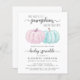 Una linda y económica invitación a los chicas y a los mellizos de niños para rociar a los bebés con "Dos dulces calabazas están en camino" escrito en una mezcla de tipografía gris moderna y escritura elegante, y acuarelas de calabaza azul rosado. Puedes personalizar el nombre de la madre y rociar detalles en una simple tipografía gris.