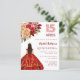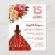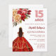 Una invitación moderna, elegante y glamurosa para una fiesta de 15 años en Quinceañera. Un fondo blanco, un chica con un vestido rojo y dorado y rosas rojos, rosados y dorados, florales. El nombre está escrito con una escritura de estilo con letras a mano moderna. Personalice y agregue los detalles de su fiesta. 1 hoja = 1 borde impreso de invitación al borde.