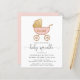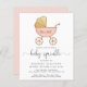 Esta encantadora invitación a rociar a una bebé con un presupuesto asequible incluye una acuarela rosa pastel y una acuarela dorada de un retro carro de bebés. Puede personalizar el texto del carro o dejar en blanco. "baby ducha" está escrito en un guión elegante con chispas.