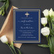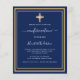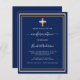 Moderna, elegante e invitada. Un fondo azul marino decorado con una cruz dorada y cuadros. Personalice y agregue un nombre y detalles. Texto blanco. 1 hoja = 1 borde impreso de invitación al borde.