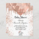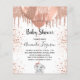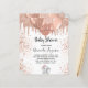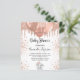 Para una ducha de bebé, para celebrar a una niña. Un fondo blanco moda. Decorada con oro rosa, goteo de purpurinas falsos rosas, pinturas que gotean, globos y un lindo chica de elefantes para bebés. Personalice y agregue el nombre del nombre de la futura madre y los detalles del fiesta. El nombre y el texto: Baby Shower se escriben con un guión de estilo con letras a mano