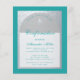Una invitación de confirmación de presupuesto. Sobre el fondo rectangular de color azul verde azulado, tiene un arco de Relieve metalizado plateado falso que tiene en el interior texto verde azulado sobre fondo blanco. La palabra Confirmación y el nombre se escriben en un guión caligráfico elegante; la primera línea es el texto en arco.